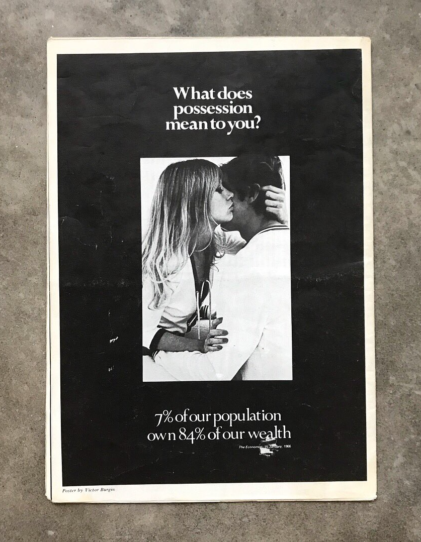 Burgin's piece was designed to look like an advertisement and encourage viewers "to start thinking for themselves [...] to stop being consumers and start being producers." It featured a 1966 statistic on wealth inequality from The Economist.
